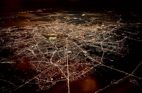 Những quầng sáng hắt lên trong đêm đồng bằng qua ô cửa sổ máy bay.