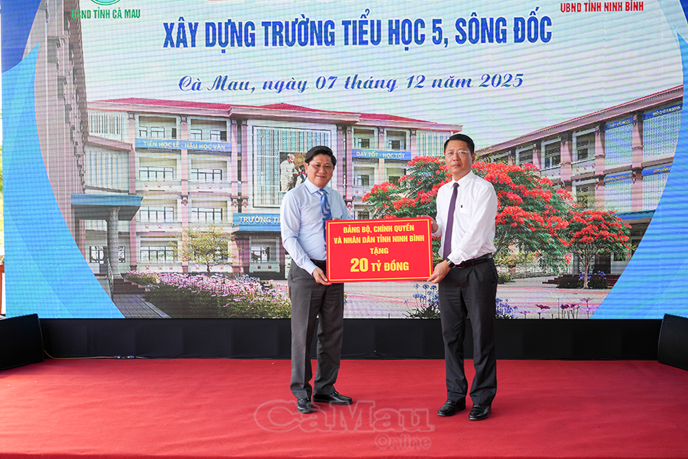 Chiều 7/12, UBND tỉnh Cà Mau phối hợp UBND tỉnh Ninh Bình tổ chức lễ khởi công đầu tư, xây dựng và nâng cấp Trường Tiểu học 5 Sông Đốc tại xã Sông Đốc. Công trình có tổng vốn đầu tư hơn 50 tỷ đồng, trong đó Đảng bộ, chính quyền và Nhân dân tỉnh Ninh Bình hỗ trợ 20 tỷ đồng.
