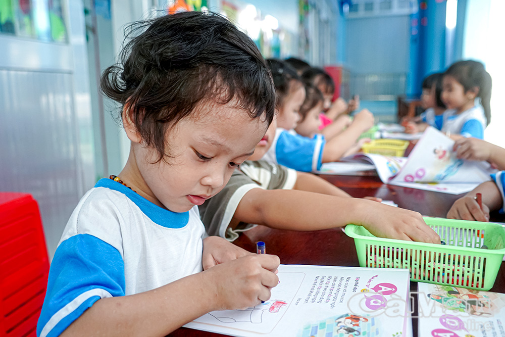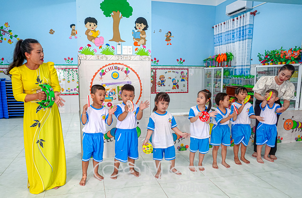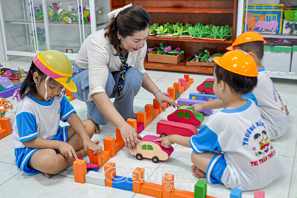 Cô Lâm Kim Thời, Tổ trưởng Khối Chồi, chia sẻ: “Giáo viên chúng tôi luôn đặt trẻ làm trung tâm. Bên cạnh quan tâm đầu tư từ nhà trường, giáo viên còn tự sáng tạo làm đồ dùng dạy học từ các vật liệu thân thuộc, tái chế để trẻ hứng thú hơn. Ngoài giờ lên lớp, chúng tôi luôn cố gắng tự học, tự rèn luyện, cập nhật phương pháp mới để nâng cao chất lượng dạy và học”.