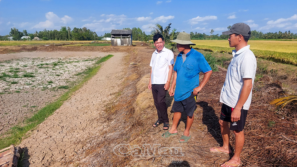 Ông Lê Văn Yên ở Ấp 3, Xã Trần Văn Thời (giữa) chờ đất dưới đáy ao khô sẽ đưa cơ giới vào cải tạo ao nuôi.