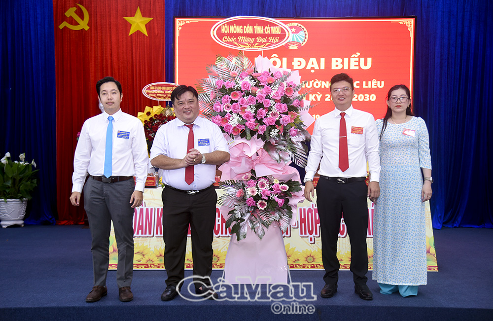 Đồng chí Nguyễn Hoàng Thoại, Phó Chủ tịch Uỷ ban MTTQ Việt Nam tỉnh, Chủ tịch Hội Nông dân tỉnh (thứ hai, từ trái sang) tặng lẵng hoa chúc mừng đại hội.