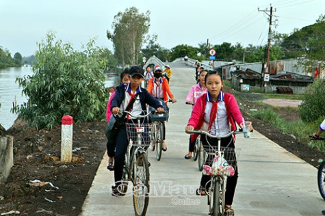 | Các em học sinh phấn khởi khi lưu thông trên tuyến lộ Đông Cái Tàu, đoạn từ kênh Hai Khẹn đến Rạch Tắc, xã Nguyễn Phích. |