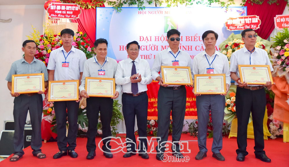Đồng chí Bùi Tấn Bảy, Phó Chủ tịch HĐND tỉnh Cà Mau, trao Bằng khen của Chủ tịch UBND tỉnh cho tập thể Hội Người mù tỉnh Cà Mau và 5 cá nhân.