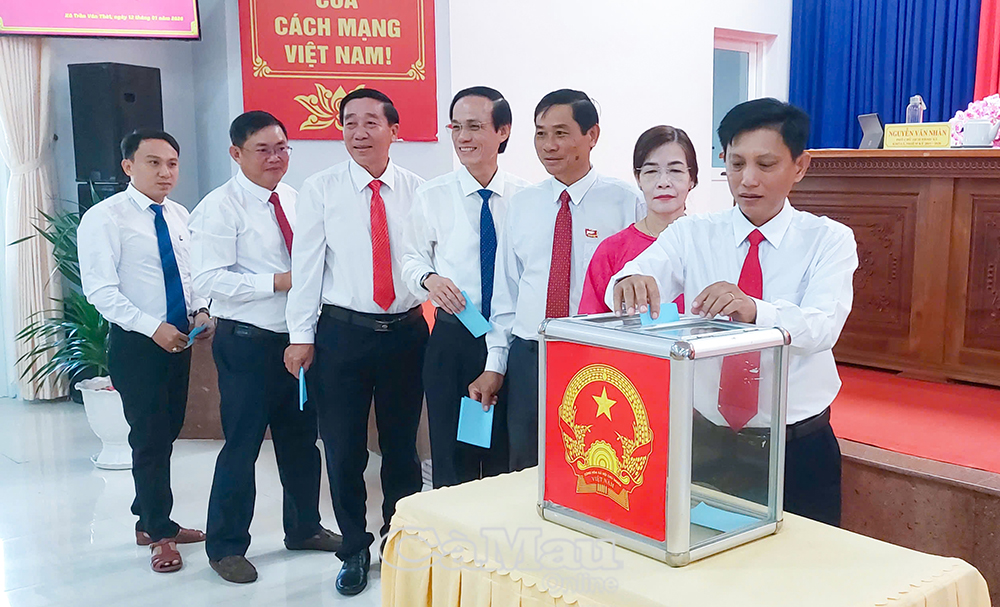 Các đại biểu bỏ phiếu bầu Chủ tịch UBND Xã Trần Văn Thời nhiệm kỳ 2021-2026.
