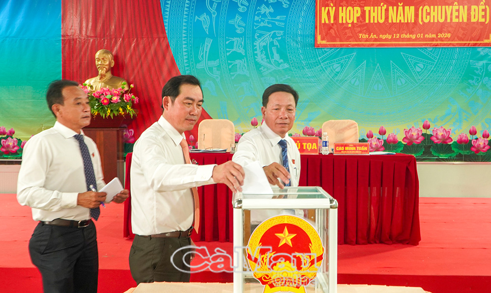 Đồng thời, thông qua xem xét tờ trình giới thiệu nhân sự, 100% đại biểu đã bỏ phiếu, tín nhiệm bầu ông Nguyễn Bắc Ái, Phó Bí thư Đảng ủy xã, giữ chức vụ Chủ tịch UBND xã Tân Ân.