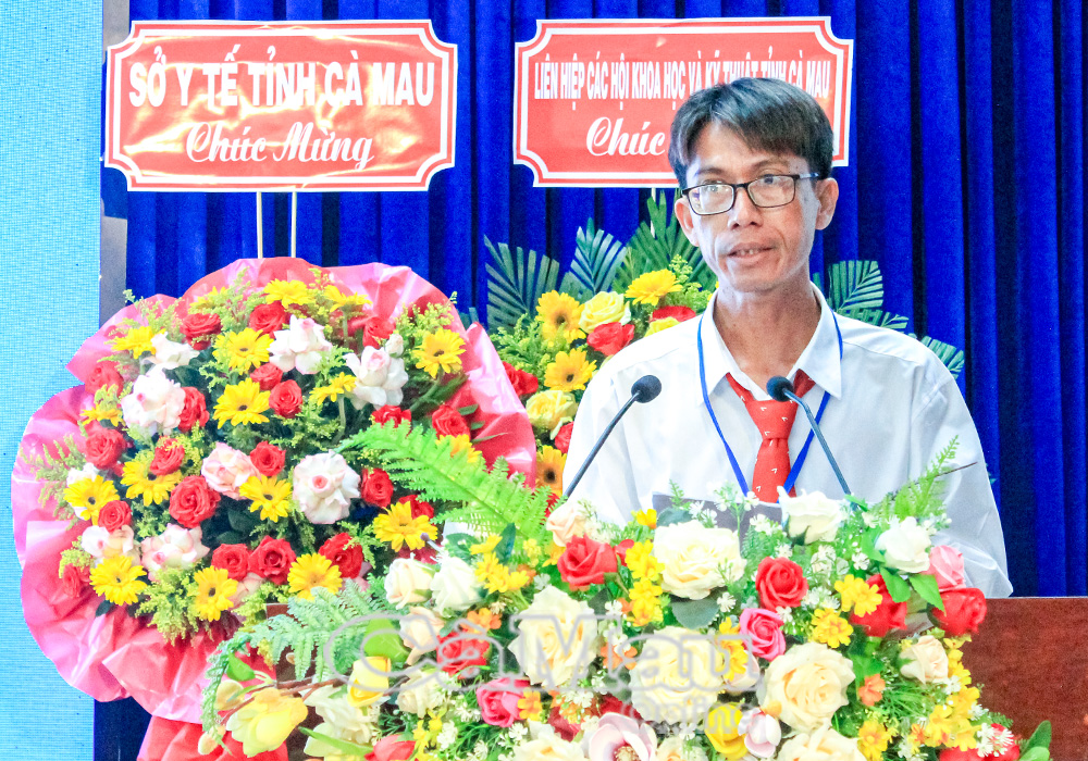 Chủ tịch Hội Đông y xã Cái Đôi Vàm Nguyễn Thanh Tiền trình bày tham luận tại đại hội với chủ đề “Công tác củng cố hội viên, kiện toàn ban thường vụ, ban chấp hành và xây dựng vườn thuốc nam mẫu ở đơn vị Hội Đông y xã Cái Đôi Vàm sau hợp nhất”.