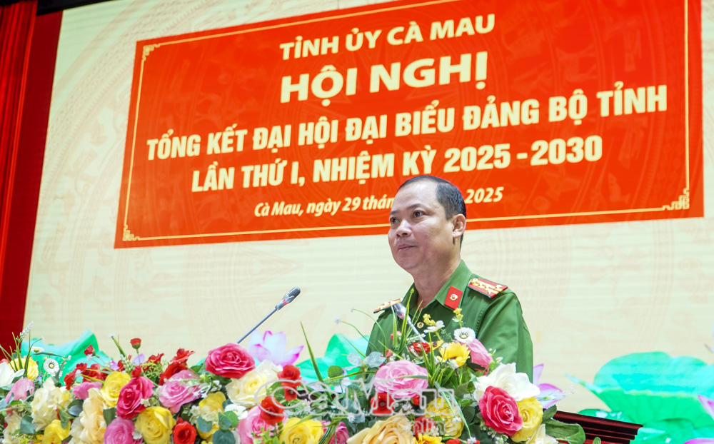 Đại tá Trần Văn Thi, Phó Giám đốc Công an tỉnh Cà Mau, phát biểu tham luận về công tác bảo đảm an ninh, phục vụ Đại hội.