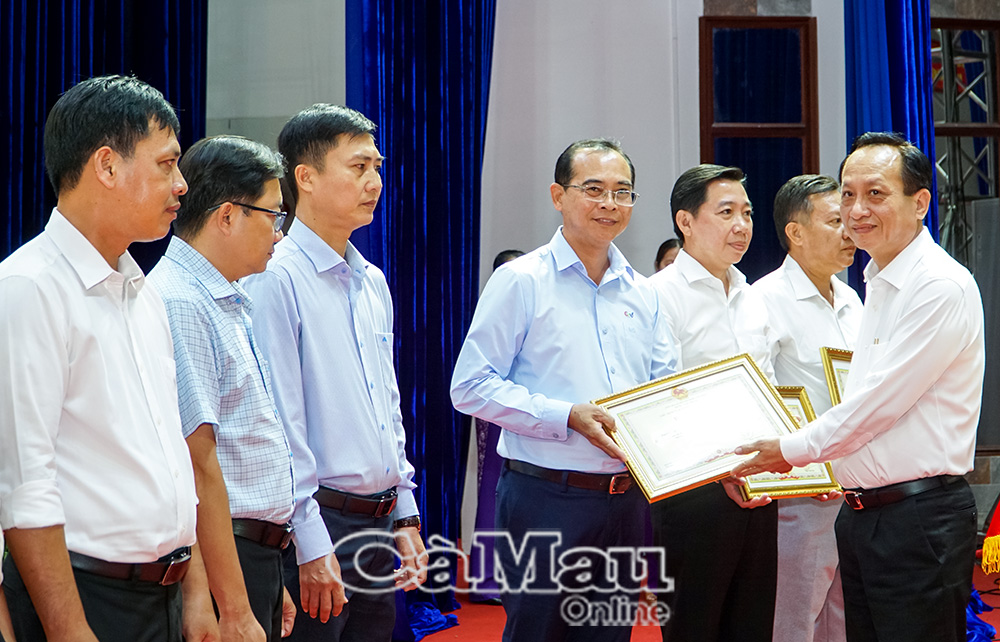 Đồng chí Huỳnh Quốc Việt, Uỷ viên dự khuyết Ban Chấp hành Trung ương Đảng, Phó Bí thư Thường trực Tỉnh uỷ, Chủ tịch Uỷ ban MTTQ Việt Nam tỉnh trao bằng khen của Chủ tịch UBND tỉnh cho các cá nhân có thành tích xuất sắc đóng góp vào thành công Đại hội.