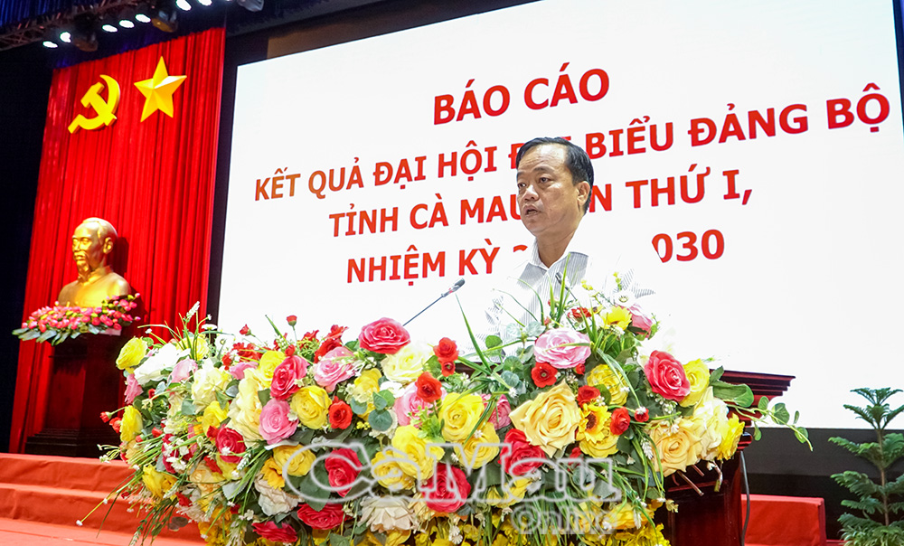 Đồng chí Huỳnh Quốc Việt, Uỷ viên dự khuyết Ban Chấp hành Trung ương Đảng, Phó Bí thư Thường trực Tỉnh uỷ, Chủ tịch Uỷ ban MTTQ tỉnh, báo cáo kết quả Đại hội.