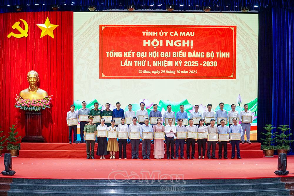 Chiều 29/10, Tỉnh uỷ Cà Mau tổ chức Hội nghị tổng kết Đại hội đại biểu Đảng bộ tỉnh lần thứ I, nhiệm kỳ 2025-2030. Dự hội nghị có các đồng chí: Nguyễn Hồ Hải, Bí thư Tỉnh uỷ; Huỳnh Quốc Việt, Uỷ viên dự khuyết Ban Chấp hành Trung ương Đảng, Phó Bí thư Thường trực Tỉnh uỷ, Chủ tịch Uỷ ban MTTQ tỉnh; Phạm Văn Thiều, Phó Bí thư Tỉnh uỷ, Chủ tịch HĐND tỉnh; Phạm Thành Ngại, Phó Bí thư Tỉnh uỷ, Chủ tịch UBND tỉnh.