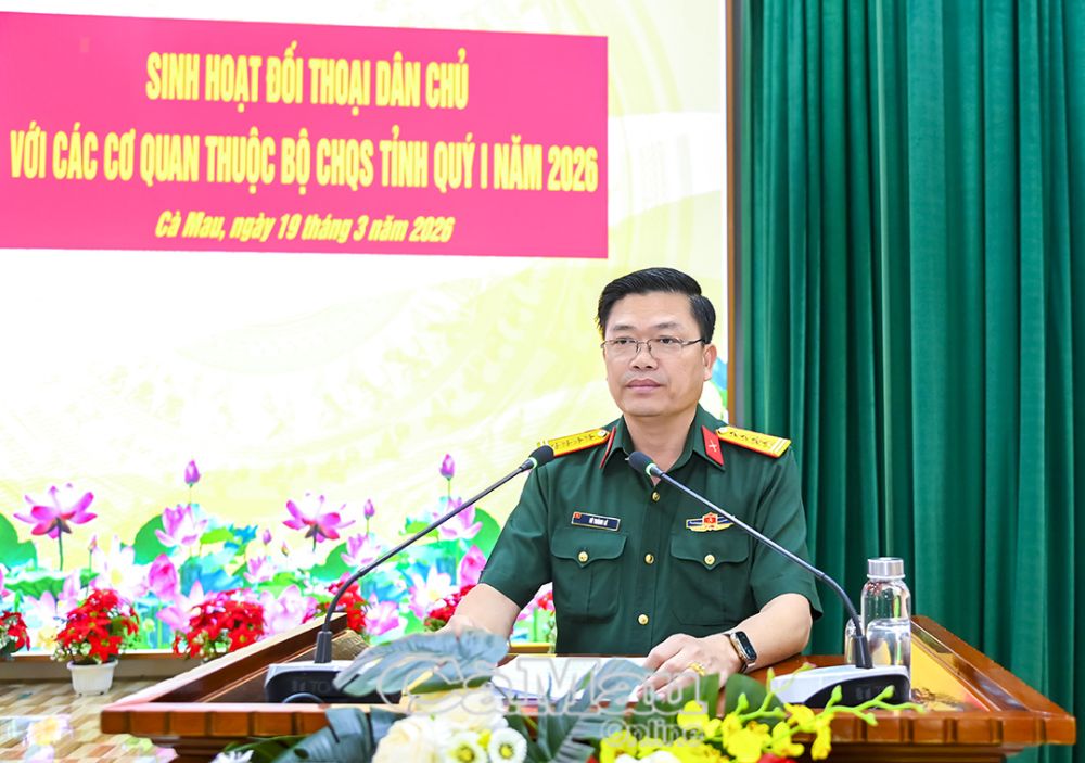Báo Cà Mau Chiều 19/3, Bộ Chỉ huy Quân sự (CHQS) tỉnh Cà Mau tổ chức sinh hoạt đối thoại dân chủ quý I/2026 với sự tham gia của 200 cán bộ, chiến sĩ các cơ quan, đơn vị. Đại tá Võ Thành Lê, Phó Bí thư Thường trực Đảng uỷ, Chính uỷ Bộ CHQS tỉnh, chủ trì.