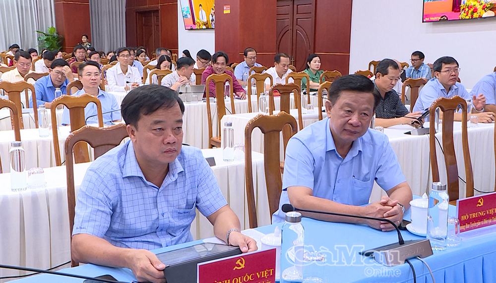 Tham dự hội nghị tại điểm cầu Cà Mau có đồng chí Huỳnh Quốc Việt, Phó Bí thư Thường trực Tỉnh uỷ (bên trái); đồng chí Hồ Trung Việt, Uỷ viên Ban Thường vụ Tỉnh uỷ, Trưởng ban Tuyên giáo và Dân vận Tỉnh uỷ.