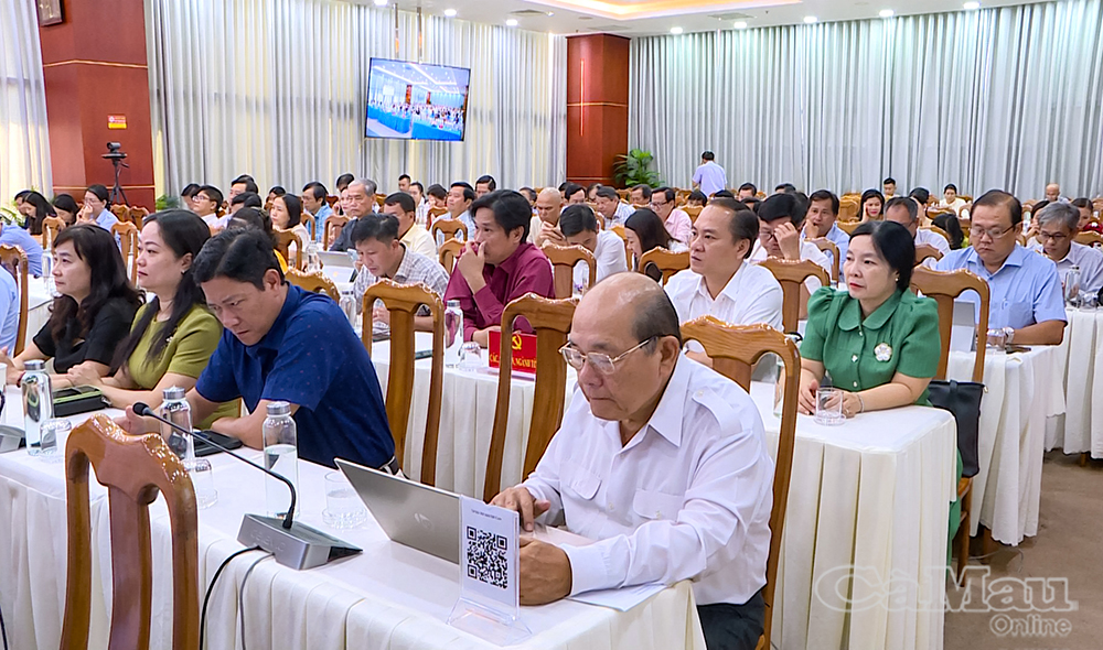 Các đại biểu dự hội nghị tại điểm cầu tỉnh Cà Mau nghe Giáo sư, Tiến sĩ Tạ Ngọc Tấn, nguyên Phó Chủ tịch Thường trực Hội đồng Lý luận Trung ương, quán triệt chuyên đề “Những điểm mới, quan trọng trong Văn kiện Đại hội lần thứ XIV của Đảng”.