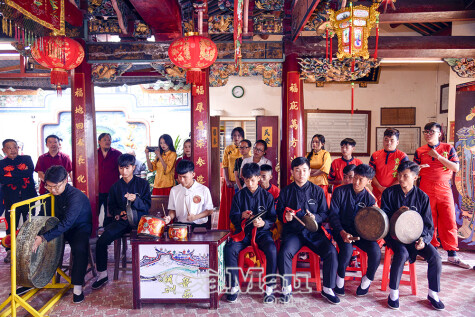 Tại Phước Đức cổ miếu, học viên thực hành thuyết minh về lịch sử hình thành, kiến trúc và hoa văn trang trí trong khuôn viên miếu; giao lưu trình diễn nhạc cụ dân tộc, múa lân và hát các ca khúc nhạc Hoa.
