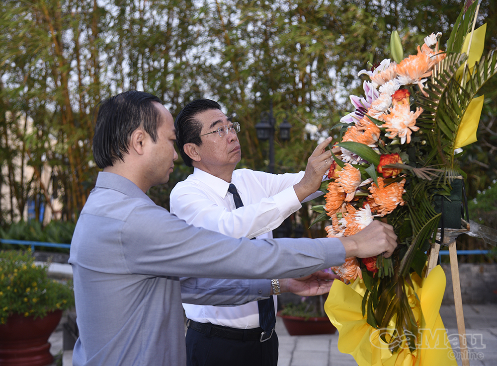 Phó Trưởng ban Nội chính Trung ương Võ Văn Dũng và Bí thư Tỉnh đoàn Cà Mau Phạm Tuấn Tài dâng hoa tưởng niệm các anh hùng liệt sĩ hy sinh trong Chiến dịch Mậu Thân 1968.