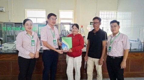 Cán bộ Phòng giao dịch NHCSXH xã Hoà Bình trao vốn vay chương trình ngành STEM cho bà Lý Thị Út, ấp Châu Phú, hỗ trợ con theo học đại học.