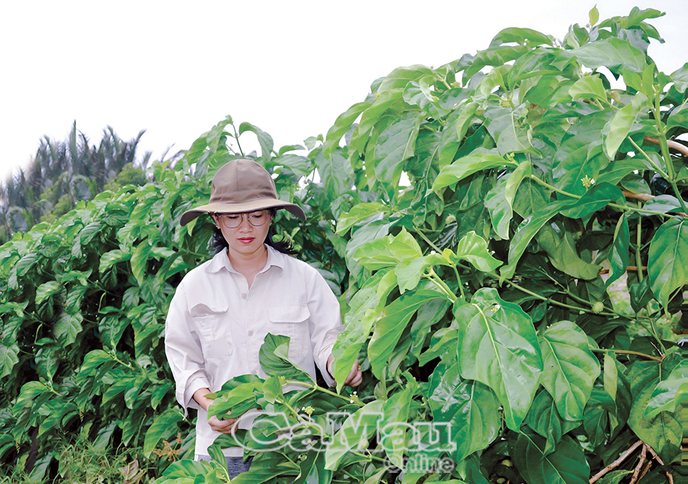 Ðể chủ động nguồn nguyên liệu sạch, chị Vy đầu tư gần 3 ha đất trồng hơn 500 gốc nhàu, canh tác hoàn toàn bằng phân trùn quế và phân hữu cơ. Xen kẽ giữa các hàng nhàu là dược liệu như mã đề, xuyên tâm liên, hương nhu tía...