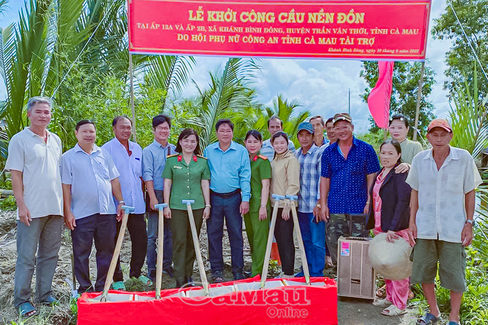 Hội viên Phụ nữ Công an khởi công cầu Nền Đồn, ấp 12A- 12B xã Khánh Bình giúp người dân trong vùng có những chiếc cầu vững vàng hơn trong việc lưu thông. (Ảnh Hội PNCA cung cấp).