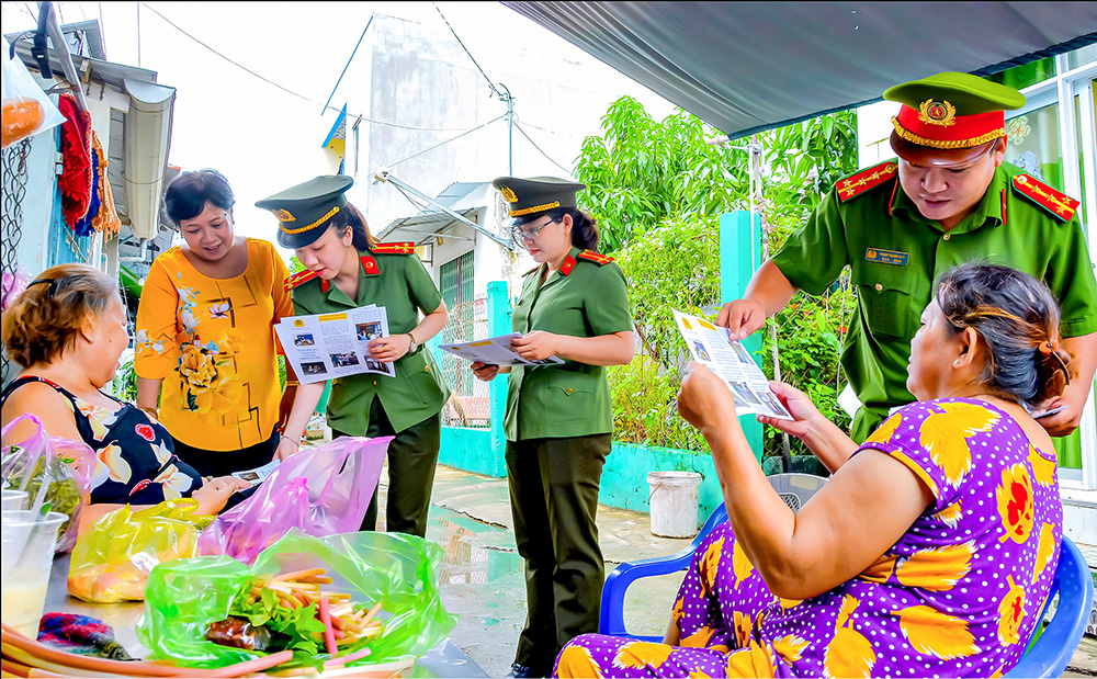 Phụ nữ Công an tỉnh Cà Mau phát tờ rơi tuyên truyền phòng, chống ma túy tại Khóm 2, phường Lý Văn Lâm, thực hiện mô hình “Khu dân cư an toàn, nói không với ma túy”.(Ảnh: Hội Phụ nữ Công an cung cấp)