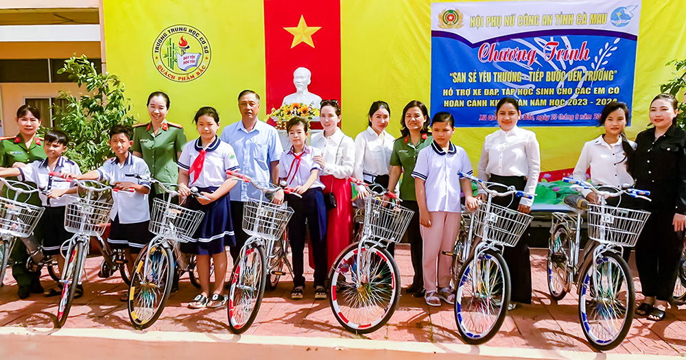 Hội Phụ nữ Công an tỉnh Cà Mau trao xe đạp cho học sinh nghèo hiếu học tại xã Quách Phẩm trong chương trình “San sẻ yêu thương - Tiếp bước đến trường”. (Ảnh: Hội Phụ nữ Công an cung cấp)
