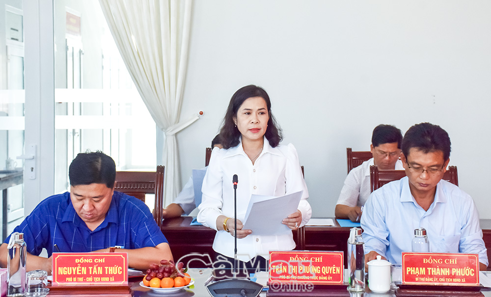Đồng chí Trần Thị Phương Quyên, Phó Bí thư Thường trực Đảng uỷ xã Phước Long, báo cáo tình hình thực hiện các mặt công tác từ khi vận hành chính quyền địa phương 2 cấp đến nay.