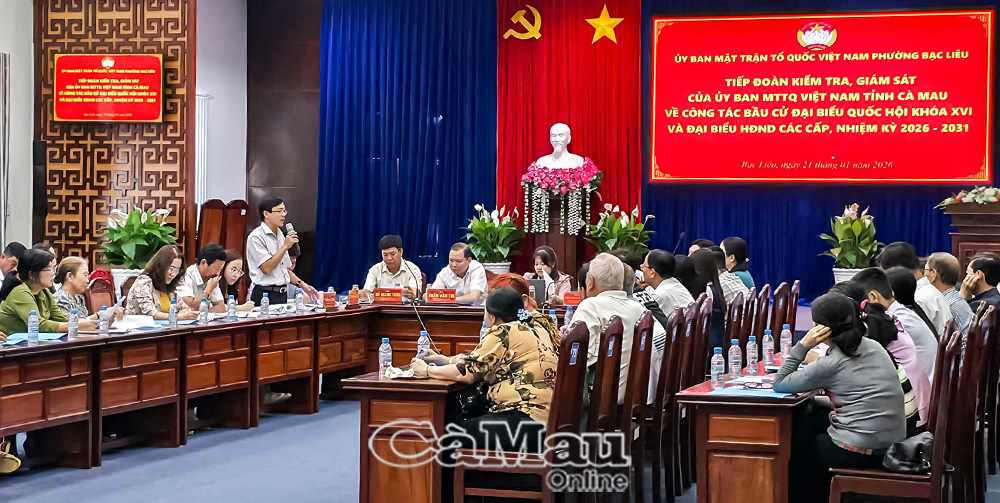 Báo Cà Mau Chiều 21/1, Đoàn kiểm tra, giám sát do đồng chí Võ Thị Ngọc Hân, Phó Chủ tịch Uỷ ban MTTQ Việt Nam tỉnh Cà Mau làm trưởng đoàn có buổi làm việc về công tác bầu cử đại biểu Quốc hội khoá XVI và đại biểu HĐND các cấp, nhiệm kỳ 2026-2031 tại phường Bạc Liêu.