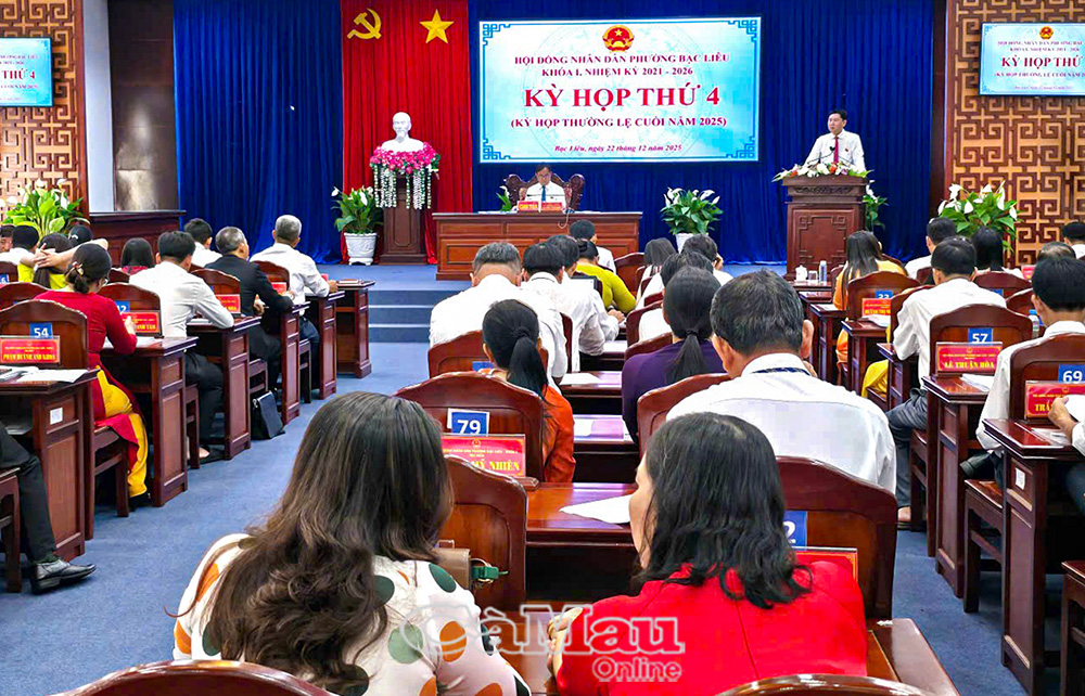 Báo Cà Mau Sáng 22/12, HĐND phường Bạc Liêu khoá I, nhiệm kỳ 2021-2026 tổ chức kỳ họp thường lệ cuối năm nhằm đánh giá kết quả thực hiện Nghị quyết phát triển kinh tế - xã hội năm 2025; đồng thời thống nhất mục tiêu, nhiệm vụ, giải pháp chủ yếu năm 2026 và quyết định nhiều nội dung quan trọng theo thẩm quyền.