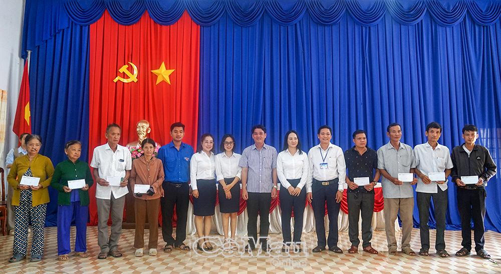 Đồng chí Nguyễn Trúc Ly, Bí thư Đảng uỷ, Chủ tịch HĐND xã, cùng đồng chí Phạm Chí Công, Uỷ viên Ban Thường vụ Đảng uỷ, Chủ tịch Uỷ ban MTTQ Xã Phan Ngọc Hiển, trao quà cho bà con.