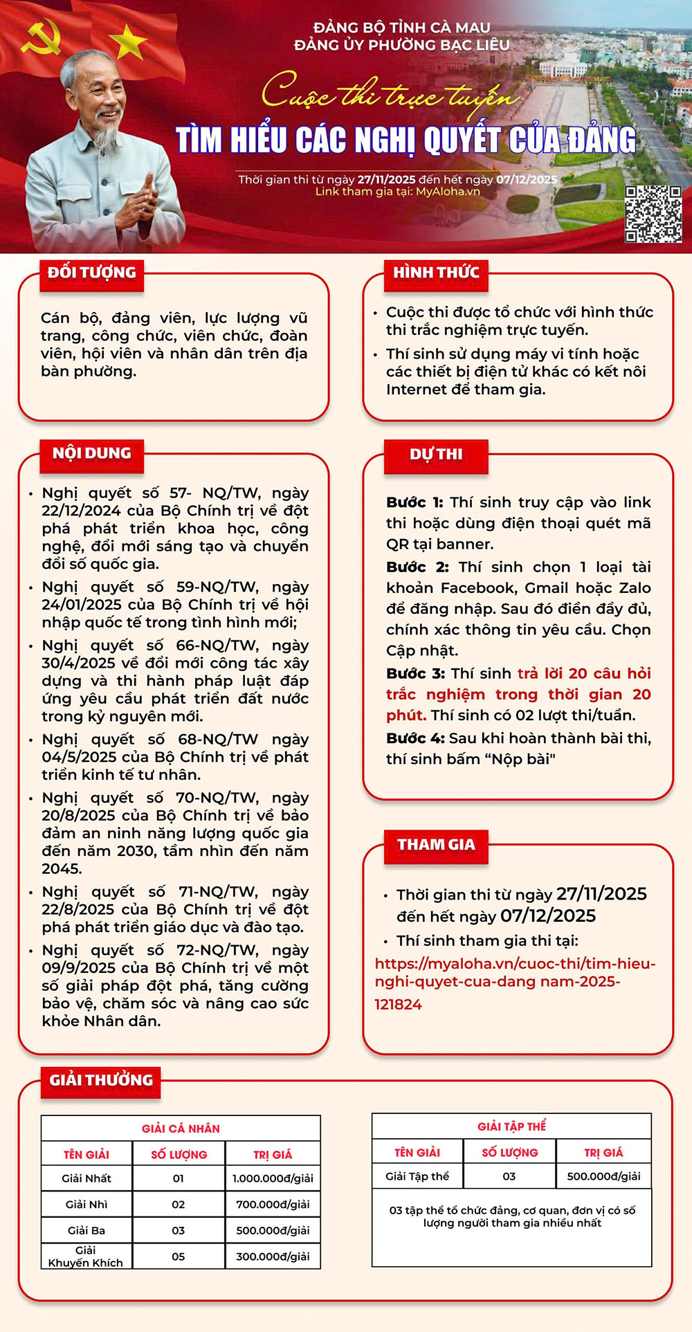 Nội dung và thể lệ Cuộc thi trực tuyến Tìm hiểu các nghị quyết của Ðảng được các cấp uỷ trên địa bàn phường Bạc Liêu tuyên truyền sâu rộng.