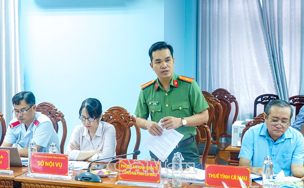 Thiếu tá Lâm Hải Âu, Phó Trưởng phòng An ninh kinh tế, Công an tỉnh Cà Mau, thành viên tổ công tác, phát biểu tại buổi làm việc với đại diện doanh nghiệp.