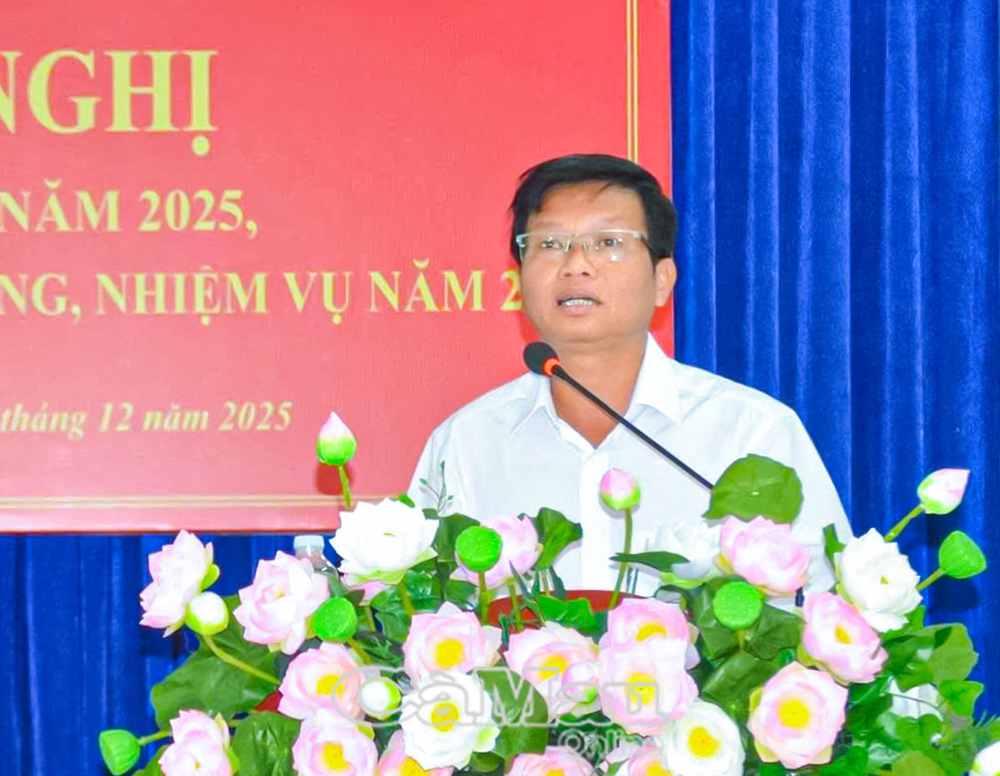 Đồng chí Huỳnh Công Cuộc, Phó Bí thư Thường trực Đảng uỷ xã Định Thành báo cáo tình hình thực hiện nhiệm vụ chính trị năm 2025, phương hướng nhiệm vụ năm 2026.