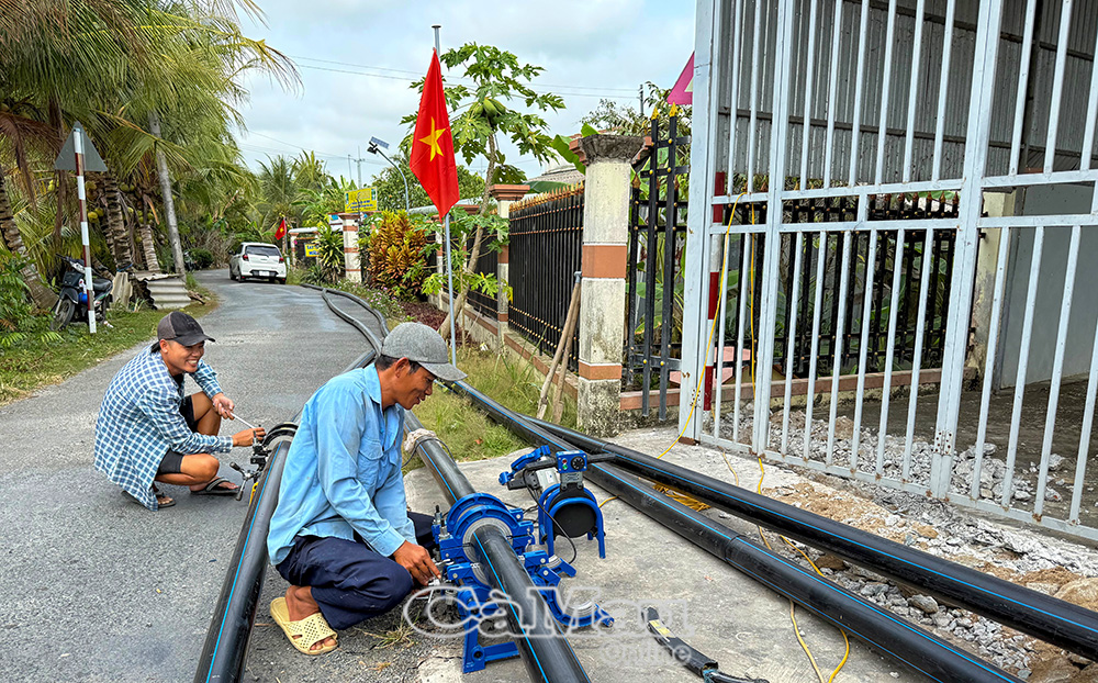 Công nhân thi công đường ống cấp nước sạch về ấp Ninh Ðiền, xã Ninh Quới. (Ảnh chụp ngày 5/2/2026).
