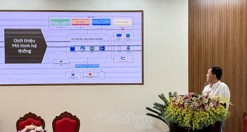 Đại diện đơn vị cung cấp phần mềm giới thiệu sơ lược về Phần mềm Nông nghiệp tỉnh Cà Mau tại buổi lễ.