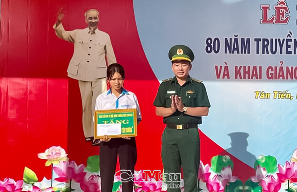 Thiếu tá Võ Hoàng Tặng, Chính trị viên Đồn Biên phòng Tân Tiến trao học bổng theo Chương trình "Nâng bước em tới trường - Con nuôi ĐBP" năm học 2025-2026.
