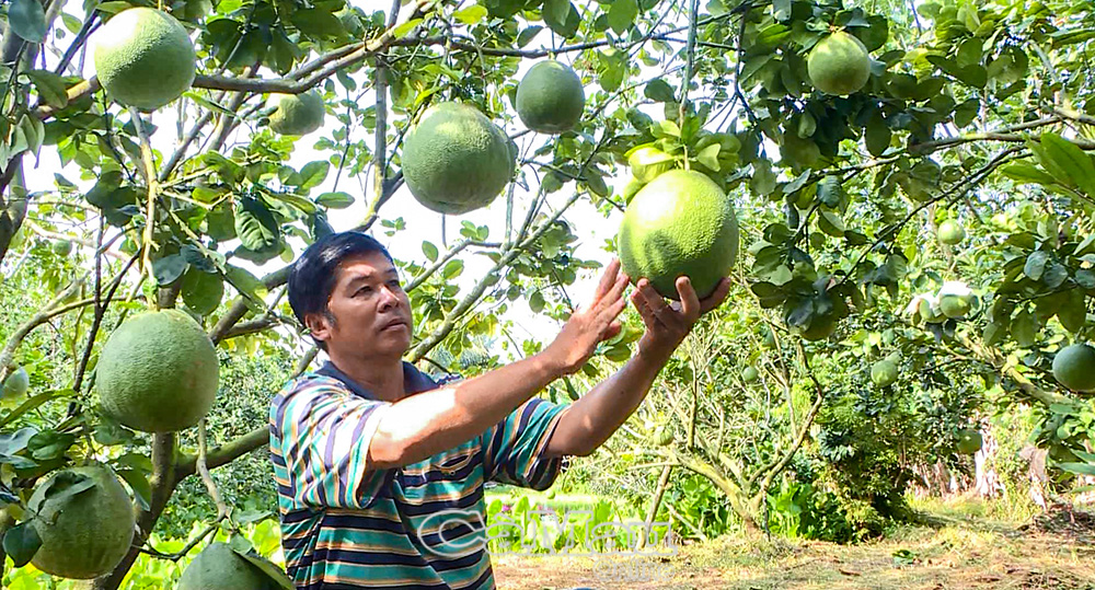 Gắn bó với cây bưởi da xanh ruột hồng từ nhiều năm nay, gia đình anh Lâm Văn Việt là một trong những hộ trồng bưởi lâu năm của HTX. Hiện vườn bưởi của anh có hơn 300 gốc đang cho trái. Từ sáng sớm, vợ chồng anh đã có mặt ngoài vườn, cần mẫn tưới nước, tuyển trái, che nắng từng quả bưởi để trái phát triển đồng đều, đạt mẫu mã đẹp khi ra thị trường Tết.