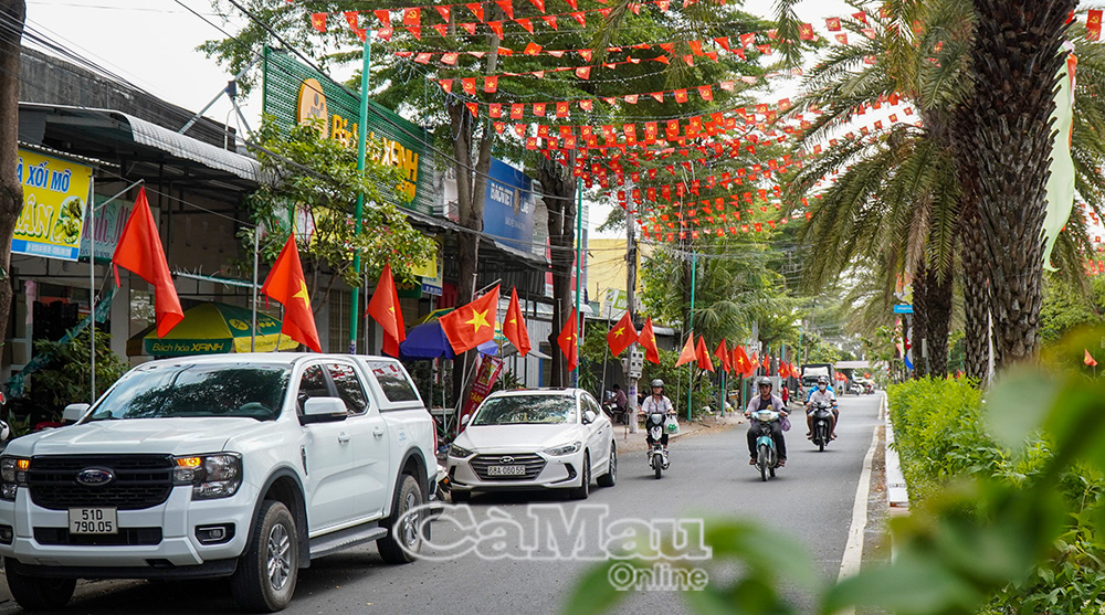 Cờ hoa rực rỡ trên các tuyến đường trung tâm xã Thới Bình trong mùa xuân đầu tiên sau hợp nhất.