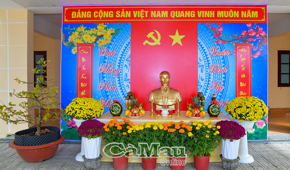Bàn thờ Bác Hồ ngày xuân được đặt ở vị trí trang trọng, với hoa tươi bày trí rực rỡ.