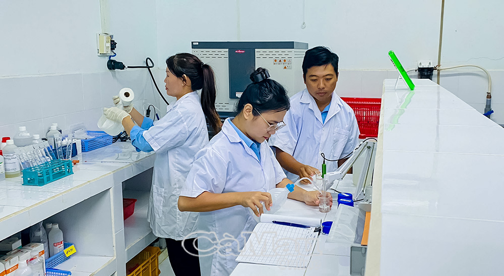 Nhân viên Xí nghiệp Cấp nước Cà Mau 1 kiểm tra hệ thống cấp nước tại nhà máy.