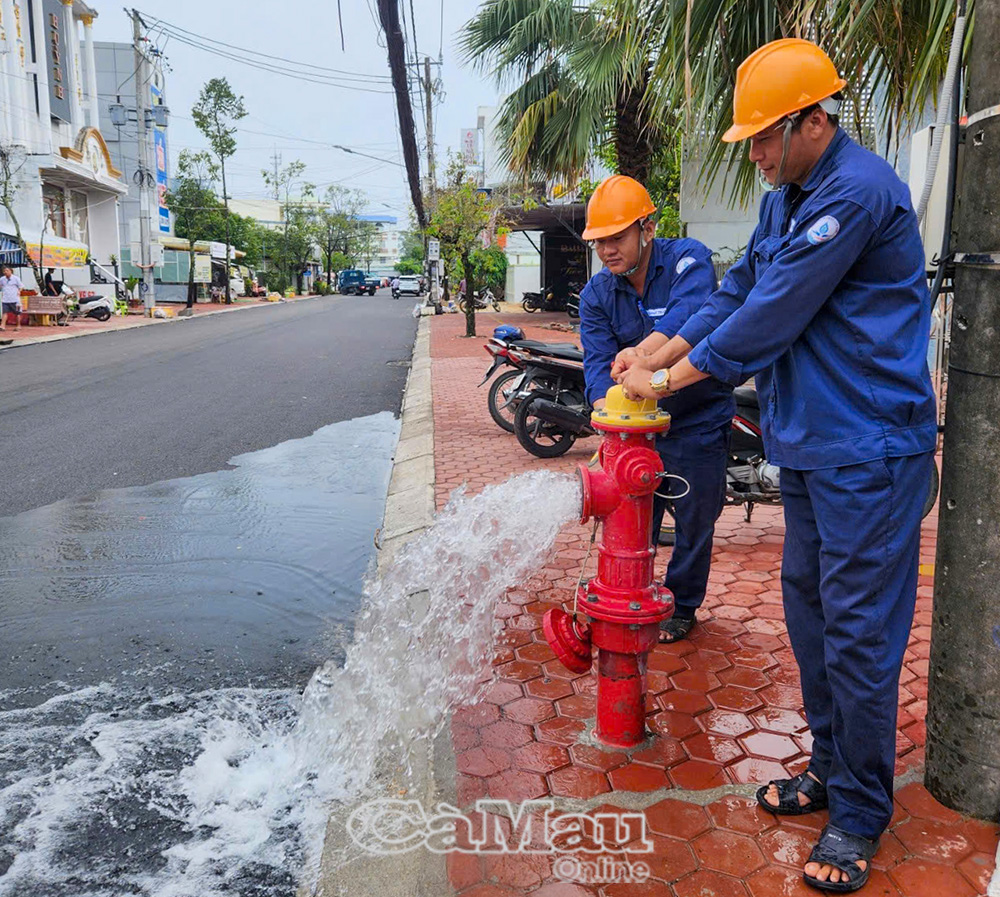 Công nhân Công ty Cổ phần Cấp nước Cà Mau kiểm tra, vận hành thử các trụ cứu hỏa trong khu vực nội ô, bảo đảm áp lực nước phục vụ hiệu quả công tác phòng cháy, chữa cháy.