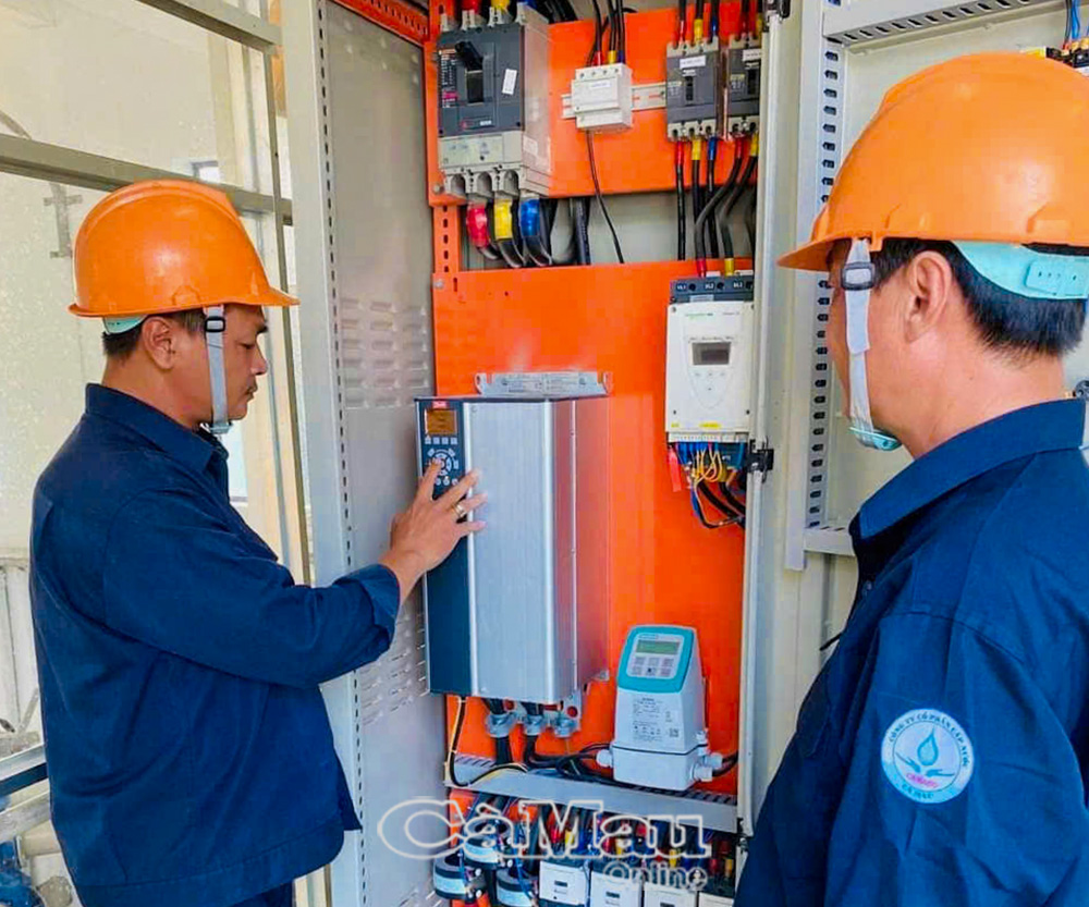 Nhân viên kỹ thuật Công ty Cổ phần Cấp nước Cà Mau theo dõi, vận hành hệ thống điều khiển tự động tại trạm bơm, bảo đảm nguồn nước ổn định, an toàn phục vụ Đại hội.