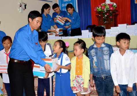| Bí thư Đoàn khối Dân Chính Đảng Lê Chí Linh tặng quà cho học sinh nghèo hiếu học xã Tạ An Khương, huyện Đầm Dơi. Ảnh: Minh Triết |