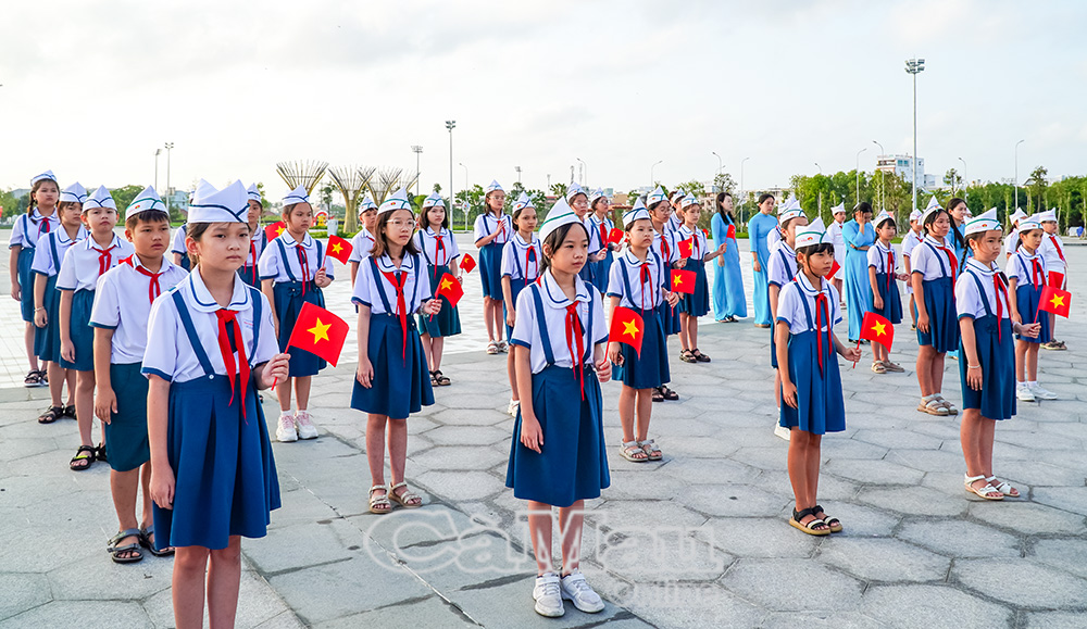 Học sinh Trường Tiểu học Phan Ngọc Hiển tham gia nghi lễ chào cờ trong buổi sinh hoạt dưới cờ tại Quảng trường Phan Ngọc Hiển.