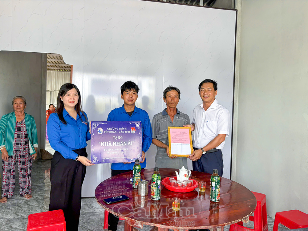 Phó Bí thư Tỉnh đoàn Cà Mau Nguyễn Thị Thuý Duy bàn giao "Nhà nhân ái" cho gia đình ông Nguyễn Hồng Quân (Ấp 7, xã Thới Bình).