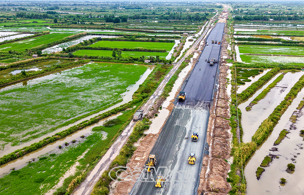 Thực hiện đợt thi đua cao điểm “500 ngày đêm hoàn thành 3.000 km đường bộ cao tốc”, Dự án tuyến cao tốc phía Đông, đoạn Cần Thơ - Cà Mau đang được thi công nước rút, phấn đấu hoàn thành vào cuối năm nay. (Ảnh chụp tại dự án thành phần trên địa bàn tỉnh Cà Mau)