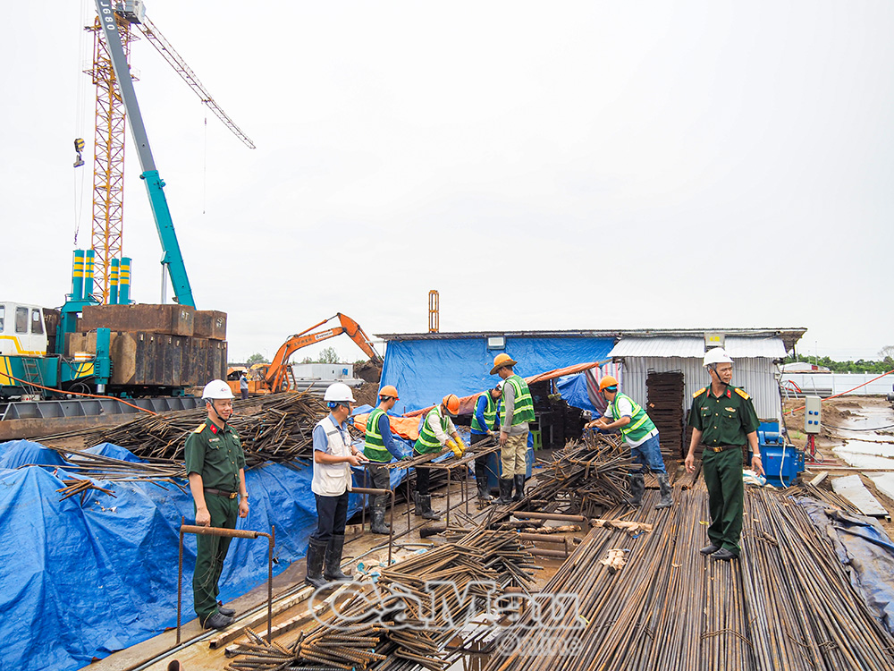 Thượng tá Đỗ Quang Tuấn (bìa phải), Chỉ huy trưởng liên danh thi công Công trình Bệnh viện Đa khoa tỉnh Cà Mau, thuộc Tổng Công ty 319 - Bộ Quốc phòng, cùng lãnh đạo công ty kiểm tra, động viên công nhân đang thi công trên công trường.