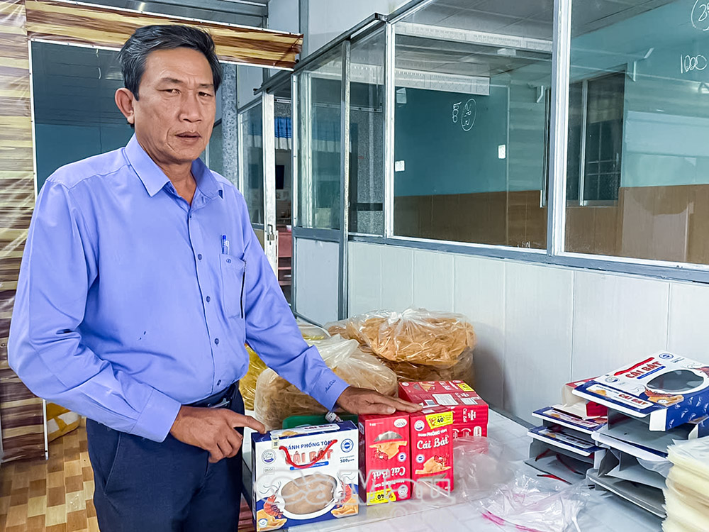 Ông Nguyễn Hoàng Ân, Chủ tịch HĐQT HTX Cái bát, giới thiệu sản phẩm bánh phồng tôm Cái Bát - món quà tập thể HTX dâng lên đại hội.