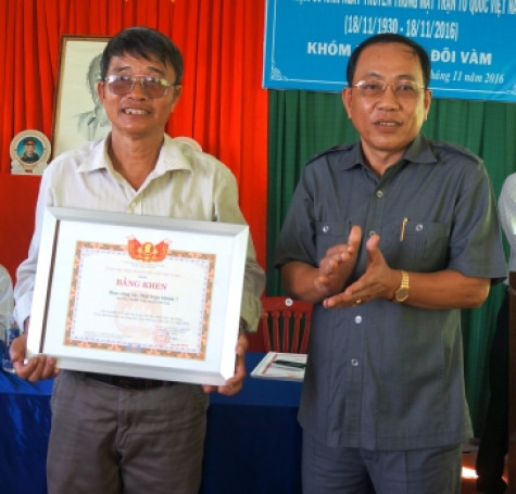 | Uỷ viên BTV Tỉnh uỷ, Trưởng Ban dân vận Tỉnh uỷ, Chủ tịch Uỷ ban MTTQ Việt Nam tỉnh Cà Mau Lê Dũng trao bằng khen cho Khóm 7, thị trấn Cái Đôi Vàm, huyện Phú Tân. |