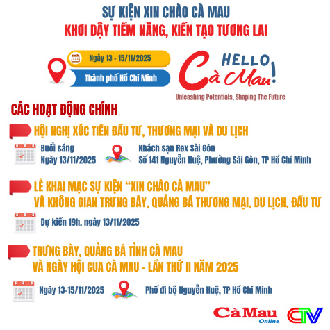 Tỉnh Cà Mau tham gia Ngày hội Du lịch Thành phố Hồ Chí Minh lần thứ 22 năm 2026, tổ chức gian hàng trưng bày với chủ đề “Cà Mau hội tụ bản sắc văn hoá phương Nam”.