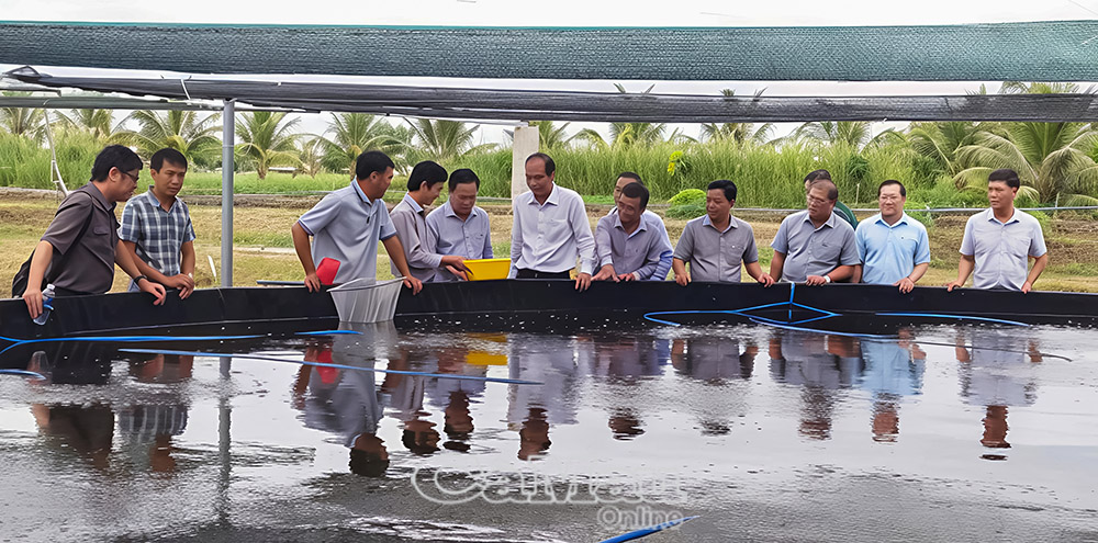 Đoàn Đại biểu Quốc Hội cùng một số sở, ngành, Liên minh HTX tỉnh tham quan mô hình nuôi tôm càng 2 giai đoạn của HTX Nông nghiệp tổng hợp Ba Đình.