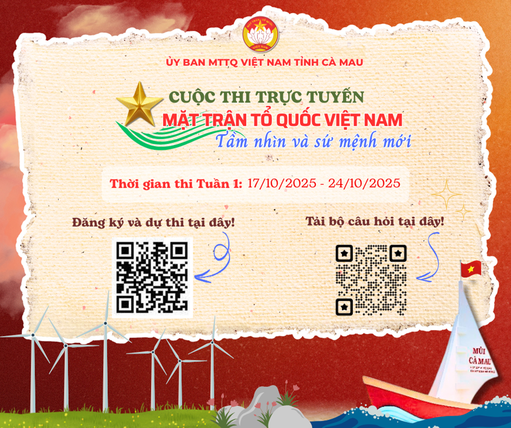 Báo Cà Mau Lần đầu tiên được tổ chức ở quy mô rộng lớn, cuộc thi trực tuyến “Mặt trận Tổ quốc Việt Nam - Tầm nhìn và sứ mệnh mới” đã tạo thành điểm nhấn trong chuỗi hoạt động chào mừng 95 năm Ngày truyền thống Mặt trận Tổ quốc Việt Nam (18/11/1930-18/11/2025) và hướng tới Đại hội đại biểu toàn quốc MTTQ Việt Nam, nhiệm kỳ 2026-2031.